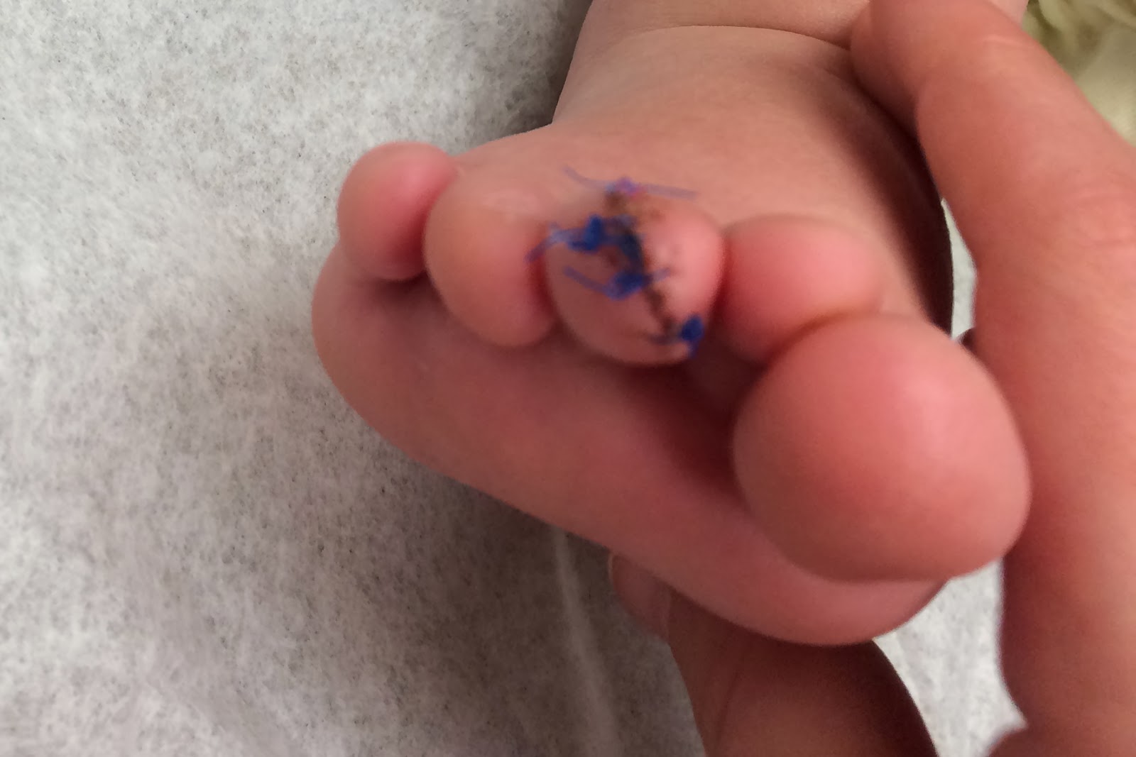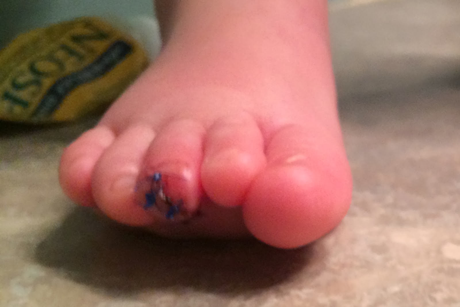 Macy beat Macklin to her first set of stitches at 21 months old. She pulled one of Daniel's weights off of our bench in the living room and it smashed her teeny tiny middle tow on her right foot. At first I thought it was going to be just a bad ouchie. Then, when I grabbed her it started bleeding. Not until I rinsed it off did I realize how open it was. We rushed into the doctors office in Eagle to get some stitches while Daniel stayed home with Macklin (oh and we had three other kids over too!). After a little debate over doing the "glue", we finally choose the stitches, for which I am thankful. I think it gave her the best option for healing. She was a trooper through it all (even with 2 hours of crying). Of course it happened right before nap time, so Macy was tired at the doctor's office and definitely did not care for the "soak it out" series of events to get rid of the dried blood. Thankfully the removal process was much better than Macklin's was last year.
