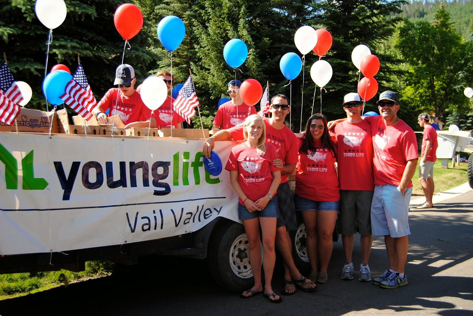 The 4th of July in the Vail Valley is one of my favorite holidays of the year! After a great 3rd of July, we got to enjoy the Vail 4th of July Parade with our Young Life group. It is by the generosity of one of our donors that we are able to have this experience. He enjoys it with his family and this has been our third year in a row being a part of the parade. This year we brought both kids in the parade with us and they really enjoyed it. We had frisbees, sunglasses, footballs, cups, and candy to toss out!